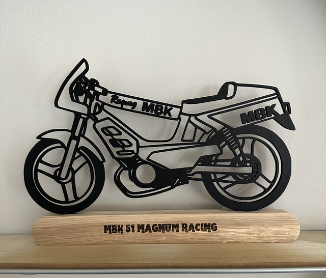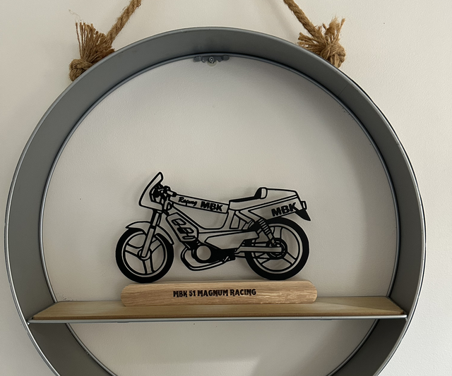 Cette décoration sur mesure capture l'esprit de votre deux-roues préféré. Fabriquée avec soin, le modèle est posé sur un élégant socle en chêne massif.